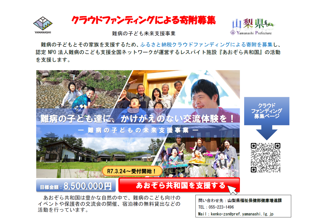 山梨県では、県内北杜市にあります「あおぞら共和国」(難病や障害のある子どもとその家族が無料で利用できる宿泊施設)の活動を支援するため、運営母体であるNPO難病こども支援全国ネットワークと協定を締結しクラウドファンディングを実施しています。